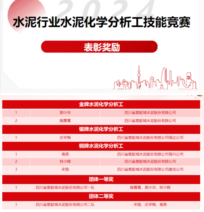 9月24日,由中國水泥協(xié)會發(fā)布關(guān)于《2024年水泥行業(yè)水泥化學(xué)分析工技能競賽》表彰獎勵的決定,對8月22日至26日,在四川綿陽舉行的2024年全國水泥化學(xué)分析工技能競賽中涌現(xiàn)出來的優(yōu)秀選手和單位進行表彰。其中,星船城公司共6名參賽選手在總共60名參加決賽的選手中脫穎而出,郭小華以總成績第1名、陶菁菁以第3名的成績,榮獲“金牌水泥化學(xué)分析工”稱號;莊學(xué)梅榮獲“銀牌水泥化學(xué)分析工”稱號;高燕、林小輝、宋艷榮獲“銅牌水泥化學(xué)分析工”稱號。星船城公司一隊(陶菁菁、郭小華、林小輝)以總成績第一名榮獲團體一等獎;星船城公司二隊(宋艷、莊學(xué)梅、高燕)以總成績第八名榮獲團體二等獎;實現(xiàn)全部參賽選手進入決賽、全部獲得個人競賽獎及團體一、二等獎的歷史最佳戰(zhàn)績。